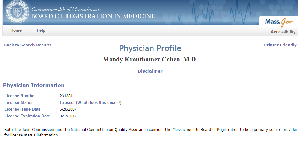 Her Massachusetts Board of Registration in Medicine notation warns: “Please note that this licensee [Dr. Pepper] does not have an active license and therefore cannot practice medicine in the Commonwealth of Massachusetts.” License Number: 231881. License Status: LAPSED [in 2012]