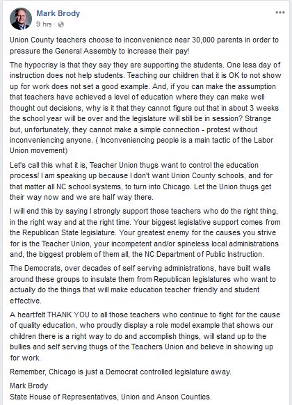 NC House Representative Mark Brody said, “Let’s call this what it is, Teacher Union thugs want to control the education process!” He said “participating teachers are inconveniencing parents by not reporting to their schools that day [today 5/16/18]. The HYPOCRISY is that they say they are supporting the students. One less day of instruction does not help students…Teaching our children that it is OK to not show up for work does not set a good example.” He says teachers should wait until school is out to protest “without inconveniencing anyone.”
